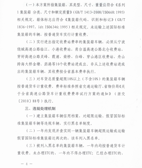 浙江省國際標(biāo)準(zhǔn)集裝箱運輸車輛高速公路通行費收費政策調(diào)整方案(試行)