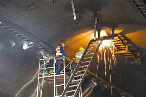 另一處作業(yè)面,負(fù)責(zé)焊接的王師傅拿著器械,正目不轉(zhuǎn)睛地盯著焊接面?!昂附訉?duì)精度技術(shù)要求很高,焊縫還要檢測,得一次成型,否則施工就不合格?!睆氖露嗄觌姾腹さ乃3Q嵬忍郏湎隆吧砑病?,“不過時(shí)間久了也就習(xí)慣了,堅(jiān)持就是勝利。”王師傅依然很樂觀地看待自己的工作。