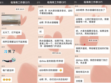 1月26日晚8:21分,臨海南收費(fèi)所微信工作群突然炸開了鍋。所有崗?fù)た照{(diào)因天氣太冷無(wú)法有效運(yùn)行,導(dǎo)致亭內(nèi)保暖效果不佳。當(dāng)班班長(zhǎng)將此情況反饋到微信工作群后,所里立即采取應(yīng)急措施,組織值班人員將熱水袋、保暖衣物等送往崗?fù)?。休息在家的員工得知情況后,也紛紛建言獻(xiàn)物,貢獻(xiàn)自己的力量。在惡劣環(huán)境中,大家守望互助,支援一線,共渡難關(guān)。
