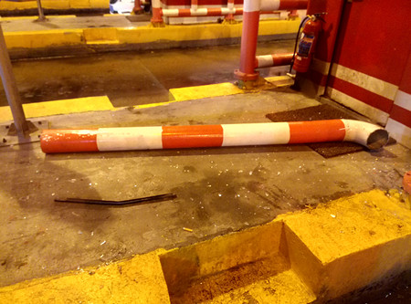 圖為被撞壞的收費崗?fù)?/span> 該車在臺州收費站下高速時,由于車身太長,司機沒察覺到車后半部分所載的傾斜的大米,出收費站時也沒有留意觀看后視鏡,導(dǎo)致傾斜的大米直接把五號收費亭防撞鋼管和收費亭邊窗玻璃撞壞,發(fā)出巨大響聲。收費班長陳幸聞聲后立刻跑到崗?fù)げ炜?/span>,五號車道右前方的防撞欄被撞斷,右側(cè)玻璃破碎,五號崗?fù)?nèi)工作臺上、地面上全是玻璃碎渣,所幸當(dāng)時崗?fù)?nèi)無人在崗,沒有造成人員受傷。 陳幸一邊通知負(fù)責(zé)路產(chǎn)勘察賠償?shù)娜藛T到場,一邊協(xié)助司機先將傾斜的幾包貨物卸下,再將車移到外廣場,以免堵住車道,影響四號車道正常通行。最后經(jīng)勘察定損,司機按規(guī)定賠償了500元。 在此,筆者提醒廣大司機朋友,過收費站時一定要慢行,注意四周的收費設(shè)施,并及時檢查所載貨物有無歪斜,既保證自己及他人的安全,也減少不必要的損失。 余娟娟