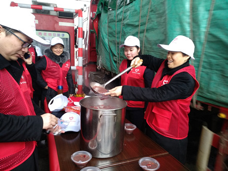 圖為志愿者給司機送上印有出入平安的“?!弊?/span> 按照傳統(tǒng),臘八節(jié)這天該喝上一碗?yún)R聚著五谷雜糧的臘八粥,可以在冬日暖身暖心,更是對寒冷歲末的美好祝愿。臺州收費所提前幾天就采購好了制作臘八粥的材料:糯米、黑米、薏仁、紅豆、大白蕓豆、蓮子、紅棗、枸杞等,食材足足浸泡了一夜,食堂工作人員從凌晨四點便開始制作,足足熬煮三、四個小時,熬出了四大鍋的臘八粥,出鍋的臘八粥濃稠軟糯、色香味俱佳。 在志愿服務(wù)現(xiàn)場,志愿者們個個身穿統(tǒng)一的紅背心,頭戴白色帽子,面帶微笑,在寒風(fēng)中迎送來往車輛,送上的不僅僅有臘八粥,還有暖心的姜茶,更有溫馨的祝福!