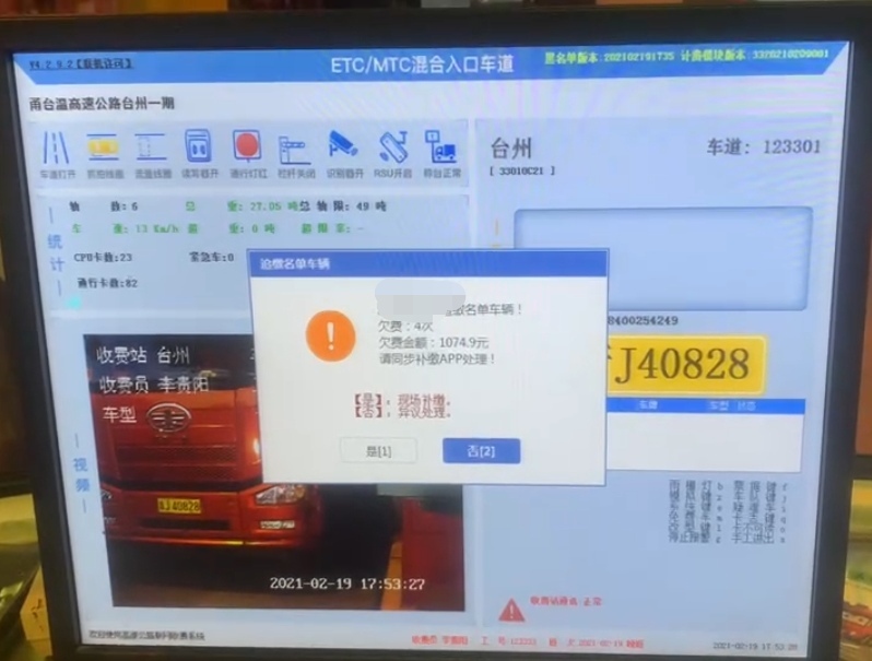 自取消省界收費站全國高速公路聯(lián)網(wǎng)后,跨省追繳通行費一直是個大難題,不少司機的省外通行費因無法追繳,造成通行費不斷流失。交通部為了適應(yīng)“全國一張網(wǎng)”稽核業(yè)務(wù)工作需要,確保各收費站現(xiàn)場有序處理追繳名單車輛,避免造成社會輿情和人身財產(chǎn)安全事件,研發(fā)了全國稽核通行費補費系統(tǒng)。 2月19日晚17點50分左右,臺州收費所進口迎來一輛車牌為浙J開頭的六類貨車,車道屏幕顯示為“浙J XXXXXX追繳名單車輛,欠費4次,欠費金額1074.9元,請同步補繳APP處理?!碑敯嗍召M員見此詢問駕駛員是否欠費,并喊來當班班長張錚過來處理。