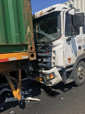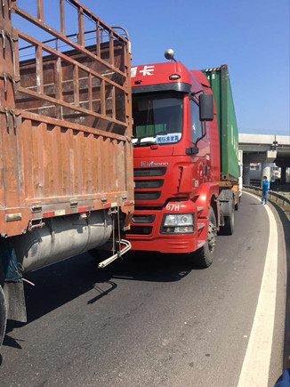 上圖為事故車輛 當(dāng)天中午,在副站崗?fù)づ哉镜墓ぷ魅藛T發(fā)現(xiàn)該所前方出口不遠(yuǎn)處有貨車停在那里不動,以致后面車輛無法通行。工作人員隨即跑到前方查看情況,原來是三輛貨車發(fā)生追尾,其中有一輛車車頭被撞得凹陷,擋風(fēng)玻璃也被撞碎,在了解事故現(xiàn)場無人員受傷后,工作人員馬上向監(jiān)控中心匯報情況。由于事故車輛較大面積滯留,導(dǎo)致后方車子堵到主線上,一些不明情況的駕駛員在車?yán)锸箘虐蠢却叽?,現(xiàn)場充滿焦躁情緒。 如何盡快疏通道路?正在食堂吃飯的一班班長潘慶耀放下碗筷跑到事故現(xiàn)場,同工作人員叫前面受損較少的事故車輛先把車子開出收費(fèi)站,再讓第三輛受損嚴(yán)重的車子試著發(fā)動車子開出去,所幸三輛車子都能開離車道。在將地上的破損碎片清理到車道兩旁后,工作人員繼續(xù)指揮車輛向前行駛,收費(fèi)內(nèi)廣場在較短時間內(nèi)恢復(fù)了正常通行。 沈芬芳