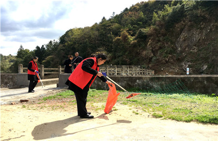 圖為女職工向當(dāng)?shù)乩先诵麄髑迕魑拿骷罀?/span> 然而,女職工們卻不“安分守己”,以這樣的方式來慶祝自己的節(jié)日:她們兵分二路,一路擔(dān)起森林防火宣傳員,向過往群眾發(fā)放《清明文明祭掃和森林防火倡議書》,并對(duì)上了年紀(jì)的村民耐心講解倡議書內(nèi)容,將臺(tái)州高速的文明服務(wù)從工作中延伸到了生活中。一路環(huán)繞水庫去清理其邊上的垃圾,一上午下來,收獲還真不少,共清理廢紙、飲料罐、塑料袋等廢棄物若干袋,在打造“生態(tài)文明”中率先垂范,擔(dān)其責(zé),盡其力。