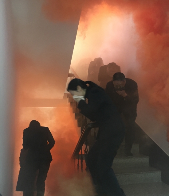 圖為樓道逃生演練 在樓道逃生演練中,大量煙霧彌漫,員工們熟練掌握逃生自救的要領(lǐng):個(gè)個(gè)用濕毛巾捂住口鼻,彎腰、沿著樓道有序快速往下逃離。 大家在突發(fā)事件面前臨危不懼、配合默契,保證了其它車輛的有序通行。在面對(duì)突發(fā)火災(zāi),也能做到有序、快速撤離。通過演練,各崗位人員不僅增強(qiáng)了安全意識(shí),也提高了對(duì)應(yīng)急預(yù)案的熟悉程度和面對(duì)突發(fā)事件的反應(yīng)、處置和自救能力。 夏蓮萍