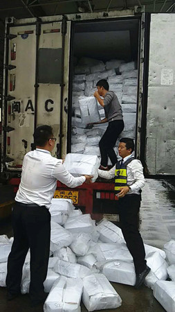 圖為工作人員幫忙搬運(yùn)掉落的貨物 這輛滿載海鮮的綠農(nóng)車,貨物掉滿車道,司機(jī)一人束手無策,當(dāng)班班長陳豐平在拍完綠農(nóng)照片后,叫上班員林葉輝,一起快速幫助司機(jī)一件一件地傳遞貨物。盡管每一袋貨物都十分重,但是他們?yōu)榱藥椭鷰煾堤嵩缯碡浳?,顧不得臉上交織的汗水和雨水?/span> 由于工作人員的幫助,司機(jī)離開時一直道謝。他們對司乘人員的主動援助,使得溫嶺西收費(fèi)所的服務(wù)不單單停留在窗口問候上,還將延伸服務(wù)一直呈現(xiàn)。 陳豐平