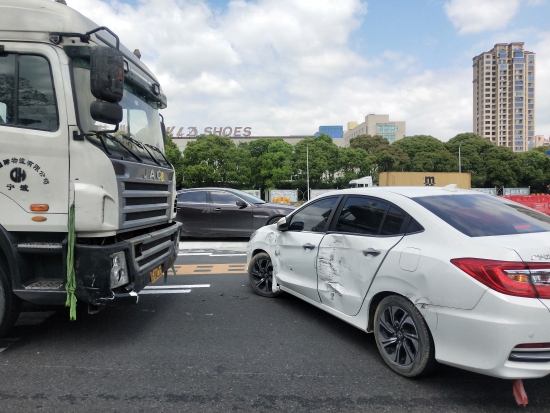 集裝箱收費(fèi)站出口變道,兩車“親吻” 高速收費(fèi)站出口,由于一些司機(jī)沒(méi)有減慢車速,沒(méi)有觀察左右方來(lái)車,或者因強(qiáng)行搶道而引發(fā)交通事故。 4月1日12點(diǎn)16分,在溫嶺西高速公路收費(fèi)站出口,突然一聲巨響,大貨車司機(jī)緊急剎車,輪胎與地面劇烈摩擦。一輛車牌為浙B的集裝箱與一輛車牌為浙C的小轎車相撞,小轎車的車門(mén)瞬間被撞得凹凸不平,且整個(gè)車身橫在集裝箱車頭前面,現(xiàn)場(chǎng)看起來(lái)似乎是小轎車司機(jī)掉頭“變道”導(dǎo)致兩車相互“親吻”。