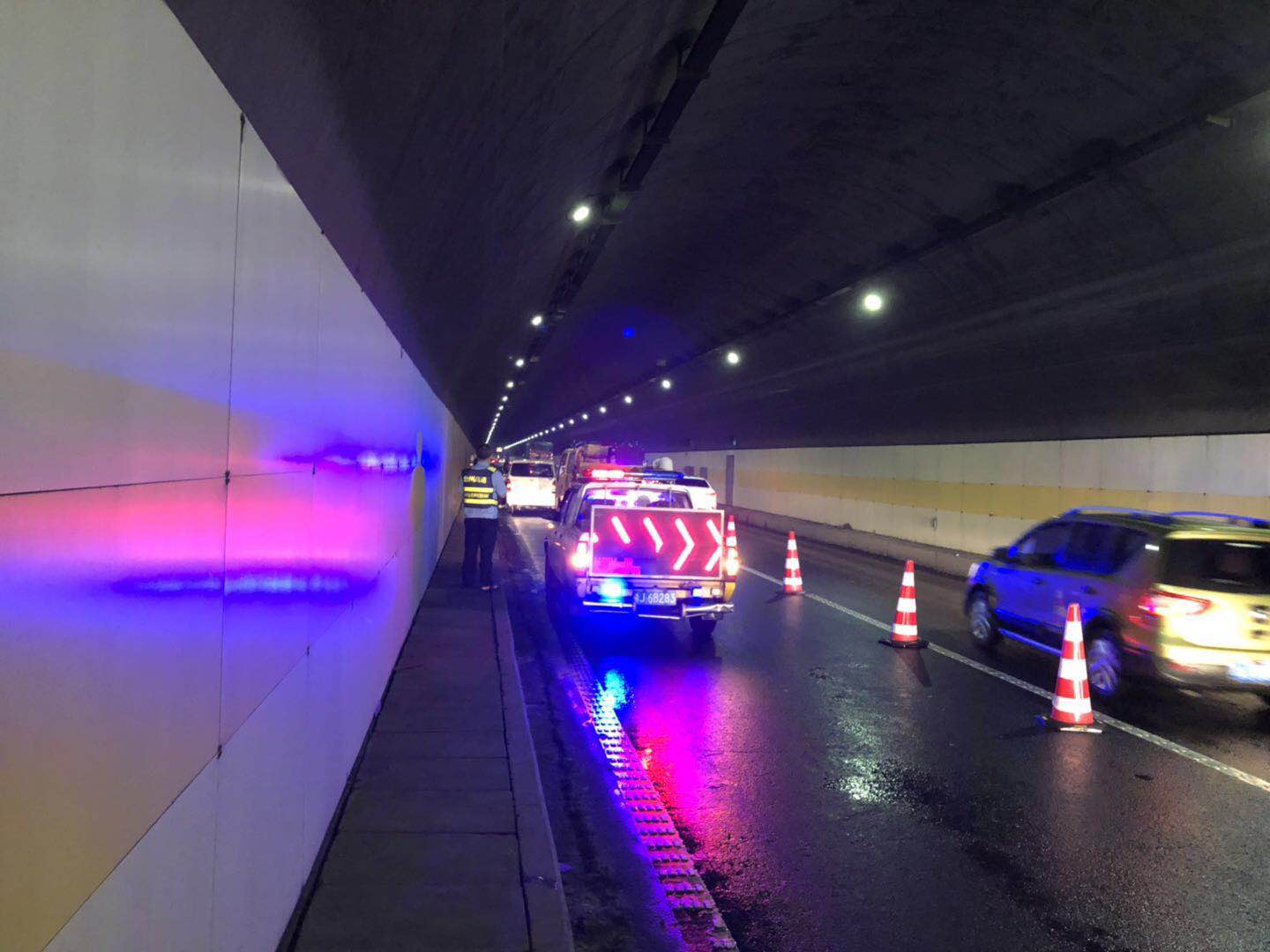 圖為事故現(xiàn)場(chǎng)預(yù)警 中控員利用錄像回放看到了驚人一幕:那輛白色面包車(chē)在黃土嶺寧向隧道K900米處,突然失控,撞上左側(cè)隧道壁,于是駕駛員慌亂中急打方向,又撞上右側(cè)隧道,現(xiàn)場(chǎng)情況猶如電影鏡頭,險(xiǎn)像環(huán)生,當(dāng)車(chē)子拋錨在洞內(nèi)時(shí),因?yàn)閳?zhí)勤隊(duì)及時(shí)出警,沒(méi)有發(fā)生二次事故,車(chē)輛受損情況也不嚴(yán)重。 在此提醒廣大駕駛員朋友,開(kāi)車(chē)時(shí)候一定要集中注意力,不要分心,避免因操作不當(dāng)造成不必要的損失,以免引發(fā)交通事故。 林玲