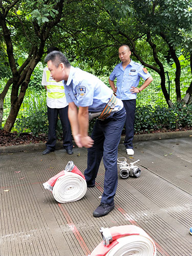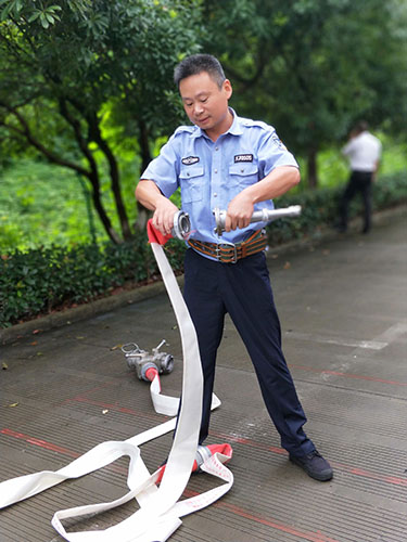 安保人員馮常敏擔(dān)任此次主講,授課內(nèi)容為兩盤(pán)水帶的鋪設(shè)和連接、連貫動(dòng)作練習(xí)。他首先進(jìn)行講解示范,并分解每一個(gè)動(dòng)作要領(lǐng)。慢慢地教新人如何操作。