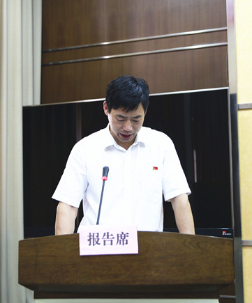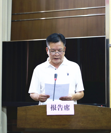 圖為公司副總經(jīng)理陳保衛(wèi)宣讀《關于轉(zhuǎn)讓臺州高速泰和房產(chǎn)公司股權的議案》