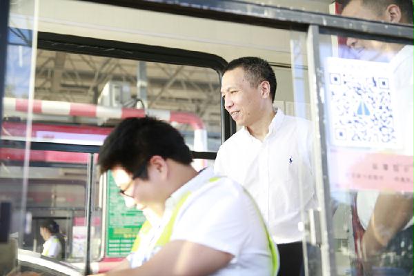 圖為集團(tuán)副董事長、總經(jīng)理張建平在溫嶺西收費(fèi)崗?fù)z查