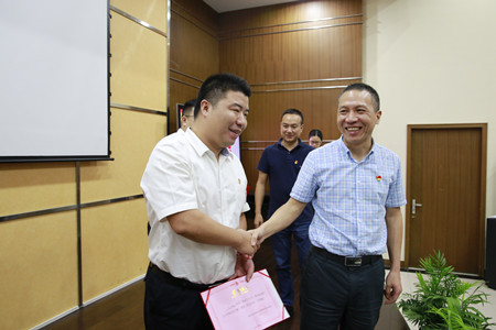 圖為集團(tuán)副董事長、總經(jīng)理張建平與第一名選手握手