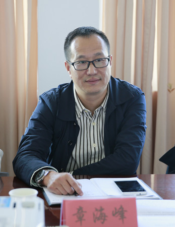 圖為集團副總經(jīng)理章海峰在座談會上與訪客交流