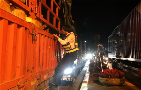 夜間綠農(nóng)車輛多,據(jù)統(tǒng)計,當(dāng)天凌晨早班臨海南收費所出口綠農(nóng)車108輛,是平時日均數(shù)量的八九倍。短時間內(nèi)的“井噴式”增長,這又是一個大考驗。“三號綠色”、“一號綠色”、“二號綠色”……“來啦!”旁站人員箭步?jīng)_過去拍照取證、檢查車輛。大貨車又高又寬,平時需登專用扶梯進行檢查,可在大流量面前保安全省時間是第一要旨,這些個巾幗女將們面對高貨車,一手拉著車把,一腳踩在車杠上,迅速上車開展核查,執(zhí)行速度絲毫不遜于男同志。有時剛從這輛貨車上下來,又立刻奔向了其它車道。晴夜當(dāng)空,車道間一個個忙碌的身影不停穿梭著,卻不言乏力。