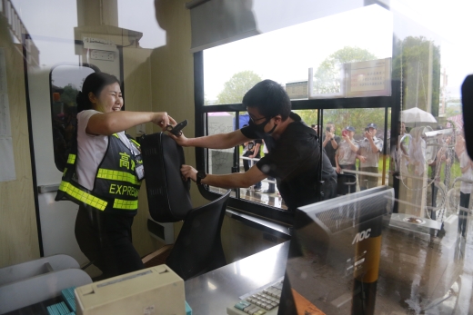 隨后,多名參演員工冒雨模擬收費崗?fù)ず土嘘犗聧徳庥觥按跬健睋尳俚那榫伴_展防盜搶演練。現(xiàn)場,2名蒙面歹徒執(zhí)仿真刀、軟棍威脅收費員交出現(xiàn)金,危機之中,收費站立即啟動應(yīng)急處置預(yù)案并報警求助,收費員有效與歹徒周旋,應(yīng)急處置組人員迅速攜鋼叉、橡膠棒、勞動工具等赴現(xiàn)場支援,值班領(lǐng)導(dǎo)、收費班長、監(jiān)控員合力協(xié)作應(yīng)對歹徒,防盜搶演練順利結(jié)束。