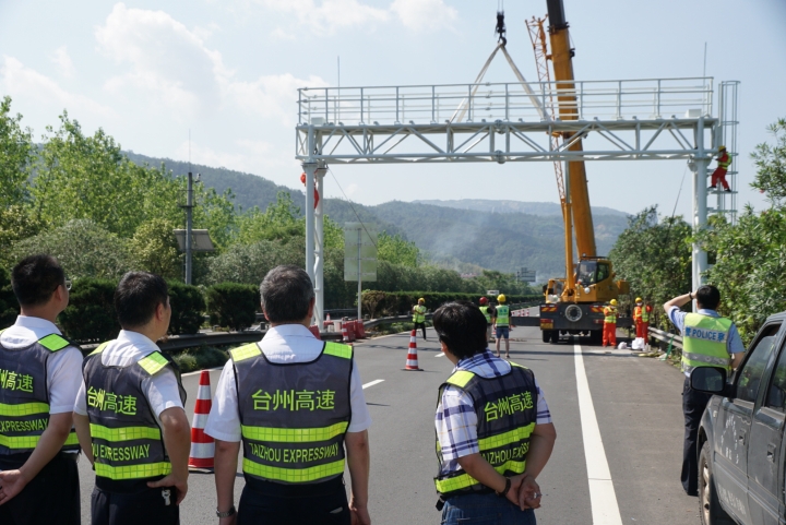 在吊裝過程中,施工現(xiàn)場只進行了短短十分鐘的交通斷流。隨著臺州高速取消省界收費站項目第一個主線龍門架吊裝完成,這也標志著此項工程進入了快車道。