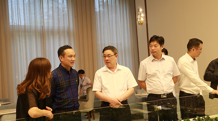 圖為陳文波等領(lǐng)導(dǎo)在沙盤前聽取有關(guān)開盤工作匯報