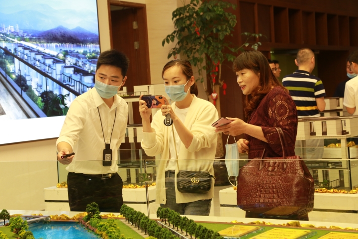 圖為陳文波對照圖紙了解樓盤情況 在銷售展廳樓盤沙盤前,陳文波聽取了高速房產(chǎn)(集團(tuán))公司負(fù)責(zé)人關(guān)于玖璽逸墅項(xiàng)目銷售計(jì)劃、認(rèn)籌客戶等情況匯報。他對前期房產(chǎn)公司的辛苦付出給予充分肯定,要求大家認(rèn)真服務(wù)好每一個來訪客戶,彰顯出國企品質(zhì),全力做好銷售工作。 當(dāng)天,銷售展廳樓內(nèi),陸陸續(xù)續(xù)有客戶進(jìn)出,“我很早就看中這個樓盤了,不僅位置好,而且采光好、通風(fēng)好,居住在這里一定非常舒服?!币幻麥?zhǔn)客戶張女士夸贊道,今天她特意前來交付認(rèn)籌金。  圖為客戶在疊墅沙盤前參觀