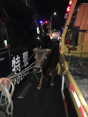 警報拉起,警燈閃爍,猛牛在施救車和巡邏車護(hù)送下,走過黃土嶺隧道,并在警車引導(dǎo)下,走向臺州收費所出口。晚7:00時在即將出口時,牛開始受驚,四處突圍,為避免事故,飛速趕過來的臺州110特警擊中了牛蹄,制伏了開始發(fā)瘋的牛。費了老大力氣,特警、交警及施救人員總算合力將牛抬上施救車安全帶下了高速公路 。 據(jù)悉,這起事件由于一輛運(yùn)牛的貨車沒有做好安全措施,行駛過程中,牛逃下了車。所幸,處置到位,沒有釀成安全事故 。 鄭蔚