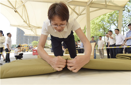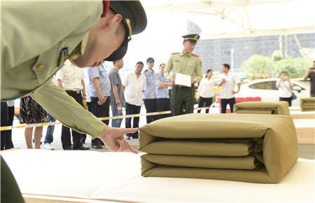 圖為教官為各位選手的“豆腐塊”裁判打分 這是集團2018年技能大比武中內(nèi)務(wù)項目比賽中的一個場景。此次內(nèi)務(wù)比賽由公司大樓、所、中心、子公司共挑出33名代表參加,比賽特邀黃巖消防大隊兩位教官擔(dān)任裁判。