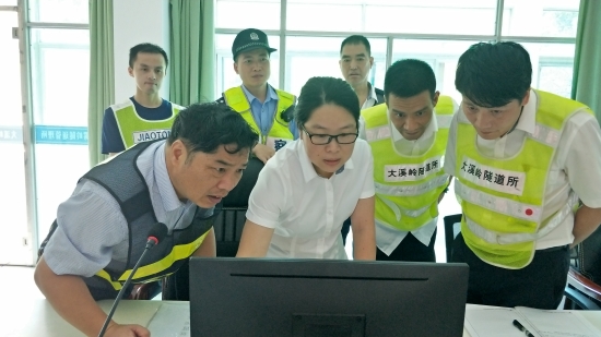 圖為項(xiàng)同富一行檢查大溪嶺隧道所中控系統(tǒng)