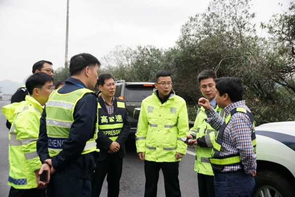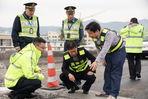 集團(tuán)聯(lián)合高速交警、路政檢查第一階段斷流施工情況 11月7日上午,集團(tuán)聯(lián)合高速交警、高速路政等單位實(shí)地踏勘了集團(tuán)沿線斷流施工現(xiàn)場,檢查第一階段施工進(jìn)展情況及現(xiàn)場交通管控點(diǎn)、收費(fèi)站分流點(diǎn)交通流等情況,集團(tuán)總工程師江輝、高速交警臺(tái)州支隊(duì)副支隊(duì)長沈汝寬、高速路政領(lǐng)導(dǎo)參加檢查。