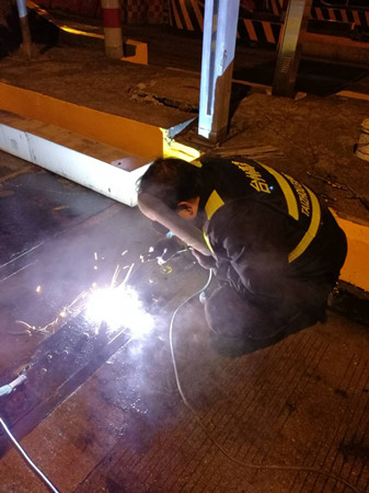 到了現(xiàn)場,隊員發(fā)現(xiàn)該車道輪檢器鐵板螺孔由于不斷摩擦并逐漸變大,導(dǎo)致整顆螺栓脫離底下固定螺座,加之當(dāng)天是春節(jié)高速免費(fèi)第一天,車輛經(jīng)過時車速都較快,直接將整塊鐵板帶離底座。如果不及時對鐵板進(jìn)行加工恢復(fù),不僅不能保護(hù)下面的輪檢器,而且還有可能造成車輛爆胎??沙σ谷考庸S都已關(guān)門,如果讓廠家發(fā)貨至少也要好幾天。正在兩難之際,中心副經(jīng)理葉俊想到將鐵板與底座邊緣直接焊死的臨時應(yīng)急方法,待節(jié)后再向廠家定制或重新購買。 方案有了,大家兵分兩組,一組去中心倉庫拿電焊機(jī)、電焊條等設(shè)備,一組待在原地清理鐵底下方於泥等雜物,為隨后的電焊工作做準(zhǔn)備。設(shè)備到位后,葉俊一手操起電焊罩,一手熟練的將電焊條點(diǎn)在了鐵板與底座邊緣之間,經(jīng)過近一個小時的處理,輪檢鐵板與地面底座牢牢地固定在一起,再也不用被飛馳而過的車輛帶離。 項寅曉