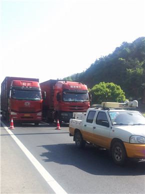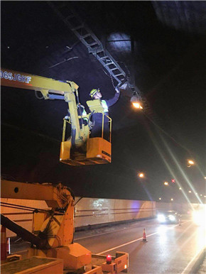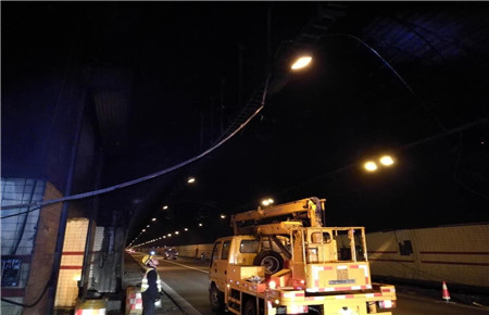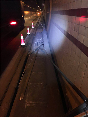 “南廣場有大貨車報警,據(jù)說發(fā)生事故……”4月17日凌晨3時55分,大溪嶺隧道中控室接到了臺州監(jiān)控中心緊急來電,執(zhí)勤隊立即驅(qū)車趕赴現(xiàn)場查勘。 巡邏車到達南廣場后,執(zhí)勤隊員發(fā)現(xiàn)溫向隧道進洞1公里處,隧道頂部的攝像頭被撞損,造成電纜橋架移位,電纜下垂橫跨車道,存在嚴(yán)重安全隱患。事發(fā)突然,執(zhí)勤隊員立刻做好安全預(yù)警措施,同時聯(lián)絡(luò)集團工程養(yǎng)護部機電維養(yǎng)中心,請求支援開展緊急搶修。