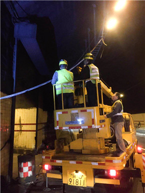 此時此刻,維養(yǎng)中心值班同志已經(jīng)馬不停蹄地奔往現(xiàn)場,中心負(fù)責(zé)人從臨海速度趕往現(xiàn)場。經(jīng)檢查,掛落電纜系汽通門控制線,不影響隧道內(nèi)照明、通訊系統(tǒng)的正常運行。當(dāng)機立斷,決定采取臨時加固的緊急措施,及時聯(lián)系協(xié)調(diào)交警部門,請求封道施工的幫助和支持。