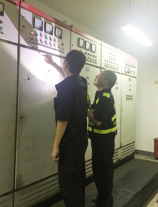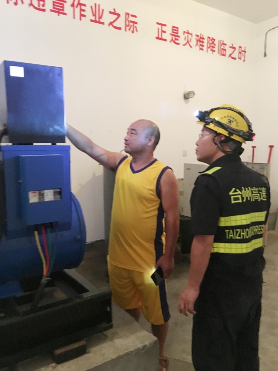 圖為搶修人員查看發(fā)電機運行態(tài)況 然而僅僅過了5個小時,28日凌晨2點20分,臨海南收費所的一通搶修電話將隊員們驚醒,臨海南收費所又斷電了! 凌晨的臨海南收費所籠罩在黑暗中,微風輕輕地吹著,除了蟋蟀的鳴叫,唯有搶修人員的手電偶爾劃破夜空。搶修隊員們很快就發(fā)現(xiàn)了故障原因,這次是市電B相沒電,因為是凌晨,考慮到電力部門外線人員不會來修復,搶修人員決定暫時采用備用發(fā)電機發(fā)電的方式,待天亮后再聯(lián)系供電部門。為了防止臨海南收費所再次陷入斷電困境,維養(yǎng)中心搶修一班班長何小敏從30公里外的張家渡連夜驅車趕到了所里,主動請纓留下來值守,待電力部門恢復正常市電后再回去。