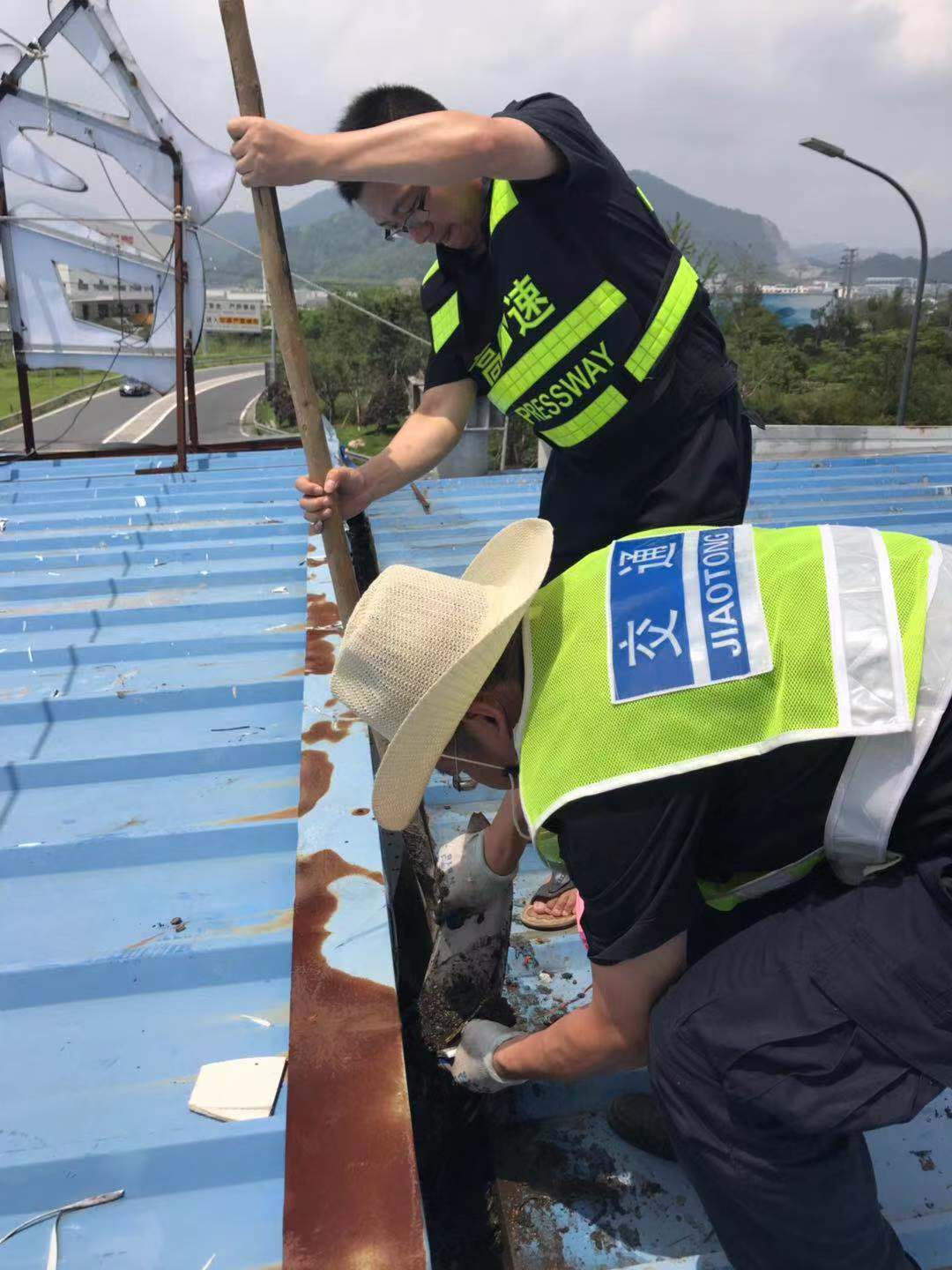 全面清除收費(fèi)頂棚及下水管道垃圾。集團(tuán)沿線(xiàn)收費(fèi)頂棚經(jīng)過(guò)幾次的施工裝修,遺留了一些裝飾垃圾,如不及時(shí)清理一旦掉入排水溝或下水管道,勢(shì)必會(huì)造成頂棚漏水,影響下面人員及設(shè)備安全。8月7日,維養(yǎng)中心組織班員在登高車(chē)協(xié)助下,頂著炎炎烈日,利用垃圾夾、鐵鍬等工具對(duì)沿線(xiàn)收費(fèi)站收費(fèi)頂棚上方垃圾、排水溝中的淤泥進(jìn)行了逐一清理,并重新鋪設(shè)排水溝上面的防護(hù)網(wǎng),防止臺(tái)風(fēng)期間吹來(lái)的一些塑料紙袋等輕型垃圾再次堵塞下水道。
