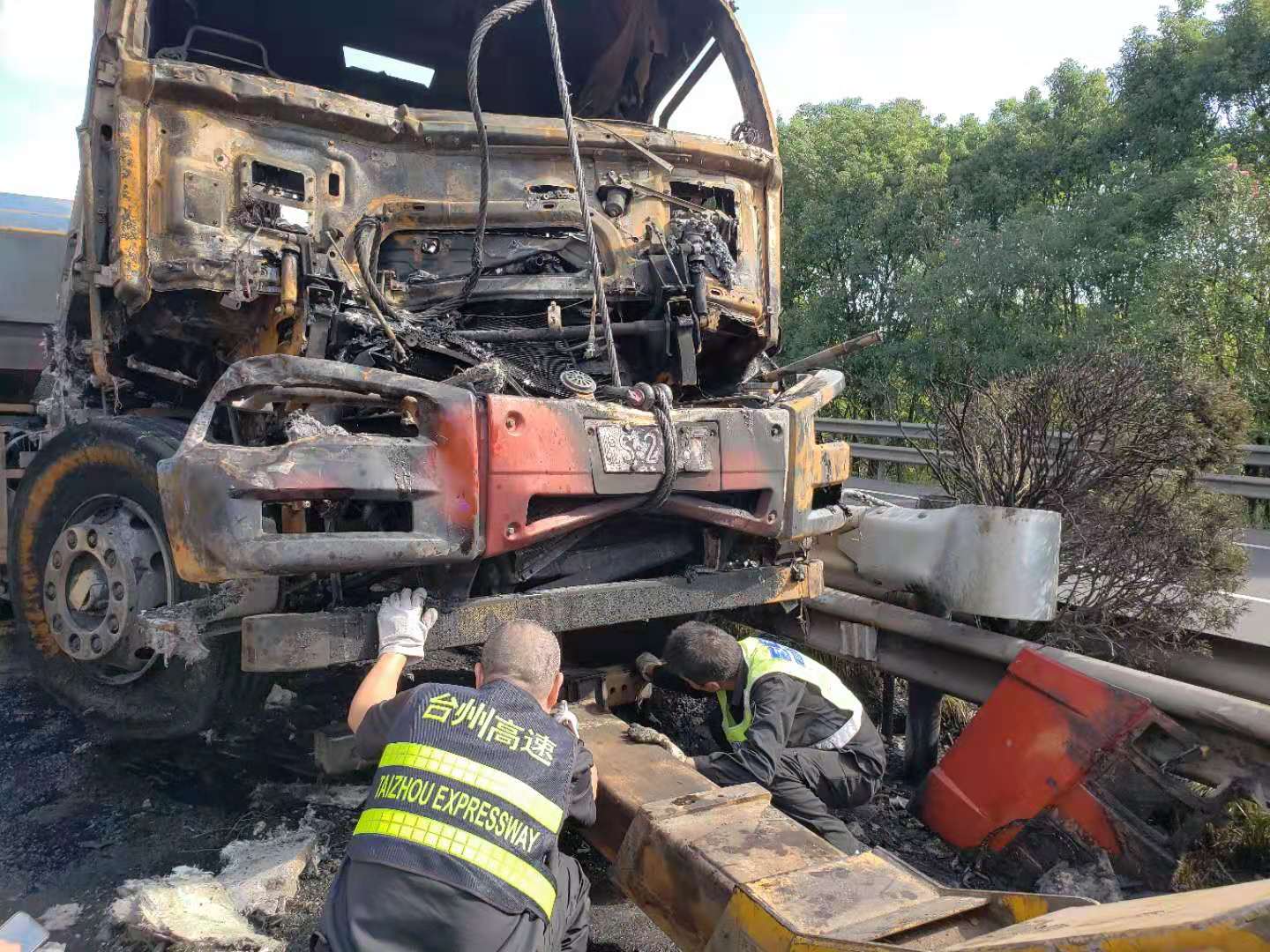大火在現(xiàn)場留下了幾乎成為殘骸的兩輛車、滿地的油污、車輛碎片、燒剩下的布匹,一股刺鼻的臭味一公里外都聞得到。油污讓路道變得又膩又滑。更為嚴重的是,隨著時間的推移,從事故點開始,堵車開始一公里一公里的蔓延,幾乎快到了臺州收費所。