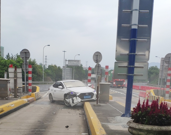 9月8日上午7點(diǎn)30分,一輛白色現(xiàn)代轎車在臺州收費(fèi)所出口準(zhǔn)備進(jìn)入ETC車道時(shí),突然撞向車道右側(cè)的全安島,在與安全島發(fā)生碰撞后,又一頭撞向了左側(cè)的安全島。 碰撞后的轎車半邊車身掛在了安全島上,車道上的光幕也因撞擊受損。收費(fèi)班長在聽到一聲巨響后,第一時(shí)間跑上前去查看情況。因?yàn)閯×业淖矒?/span>,轎車的右側(cè)已經(jīng)在地上灑落一堆碎片。坐在副駕駛的女士從車上下來查看車況,隨后男司機(jī)也從另一邊打開車門下來。所幸撞擊并未造成人員受傷。班長在確認(rèn)司機(jī)及乘客均無受傷后,一邊將事故報(bào)告監(jiān)控中心讓施救車輛前來救援,一邊提醒司機(jī)報(bào)警,人員站到安全島上方,不要隨意在車道上走動(dòng)。然后迅速跑到車道入口將水碼擋在車道口以防止有其他車輛誤入發(fā)生二次事故。
