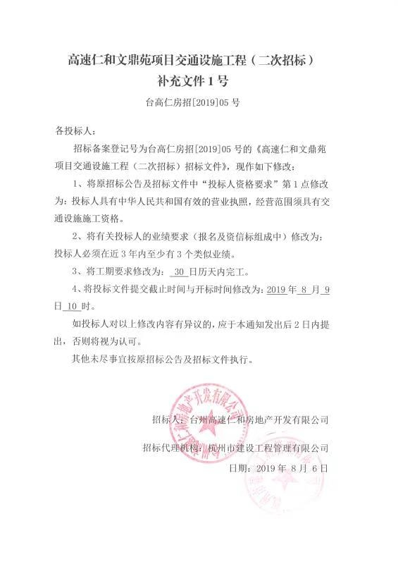 高速仁和文鼎苑項(xiàng)目交通設(shè)施工程(二次招標(biāo))補(bǔ)充文件1號(hào)