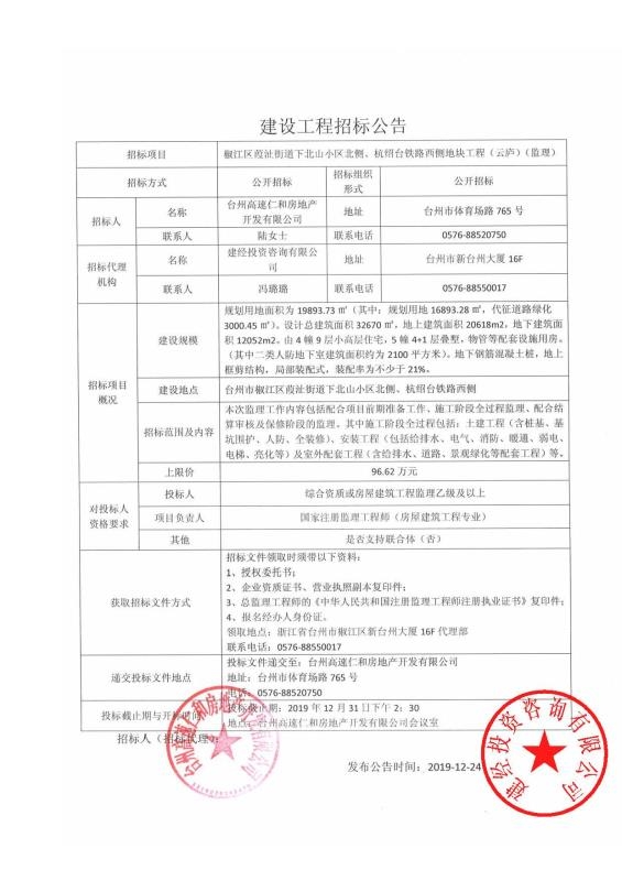 椒江區(qū)葭沚街道下北山小區(qū)北側(cè)、杭紹臺鐵路西側(cè)地塊工程(云廬)招標(biāo)公告