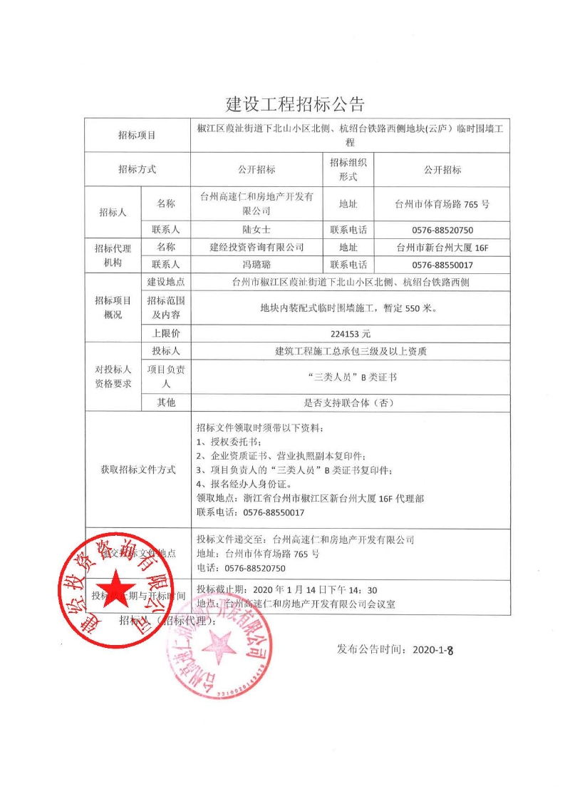 椒江區(qū)葭沚街道下北山小區(qū)北側、杭紹臺鐵路西側地塊(云廬)臨時圍墻工程招標公告