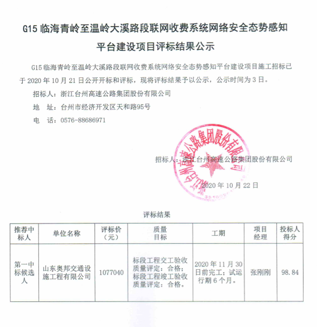 G15臨海青嶺至溫嶺大溪路段聯(lián)網(wǎng)收費系統(tǒng)網(wǎng)絡(luò)安全態(tài)勢感知平臺建設(shè)項目評標(biāo)結(jié)果公示