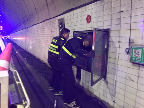 圖為工作人員檢查消防設備 冬日的隧道內(nèi)寒風刺骨,執(zhí)勤隊員在轟鳴不止的噪音以及嗆人的汽車尾氣中,有條不紊地開始隧道清洗及設備檢修工作。一組人員站在登高車站臺上,檢修故障攝像機及燈具,擦拭隧道內(nèi)每個攝像機鏡頭、LED燈具。一組人員手持電筒,打開每一個消防設備箱,逐一檢查水帶、消防水龍頭、管道閥門等設施設備,仔細地排查各類安全隱患。 “再等2號故障攝像頭檢修清洗結(jié)束后回來。”已過下午1點鐘,黃土嶺隧道所副所長盧祖理還沒吃午飯,仍然埋頭于工作。