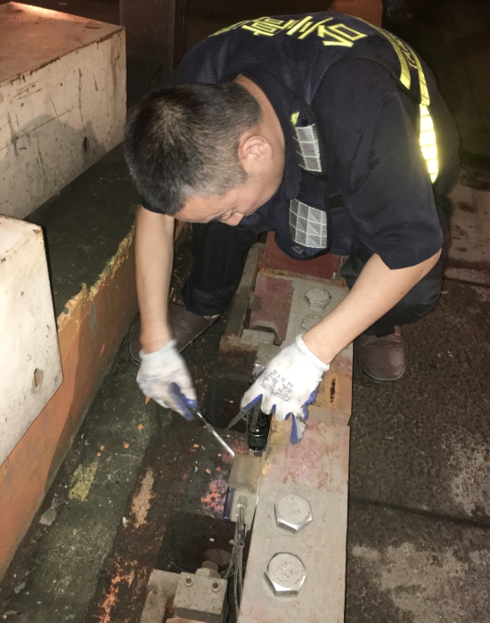 圖為張鵬在搶修計(jì)重稱(chēng)臺(tái)