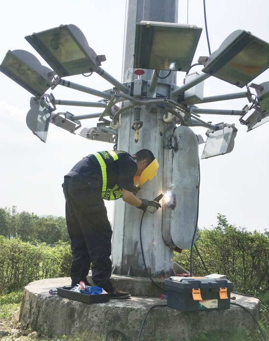 圖為張鵬在焊接被臺(tái)風(fēng)刮掉的高桿燈電箱門(mén)