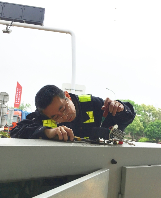 歲月滄桑,時(shí)光荏苒,如今張鵬兩鬢已顯斑白,眼睛也有些老花,但依然精神抖擻,干勁十足。8月12日,臺(tái)風(fēng)過(guò)后的臺(tái)州南收費(fèi)所內(nèi)廣場(chǎng)有兩盞路燈同時(shí)失效。當(dāng)?shù)歉哕?chē)過(guò)來(lái)的時(shí)候,盡管當(dāng)時(shí)他因痛風(fēng)雙腳腫大還沒(méi)完全消退,但仍第一個(gè)跳上去維修,站在狹小車(chē)兜里佝僂著身子,戴著老花鏡更換各種設(shè)備。8月的烈日炎炎似火燒,沒(méi)過(guò)一會(huì)豆大的汗珠從他額頭上淌下透濕了全身。