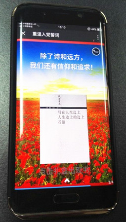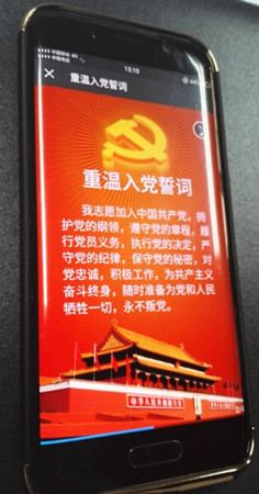 “凝視黨旗,我把奉獻(xiàn)刻心里;舉起右拳,我把責(zé)任刻心里;宣讀誓言見(jiàn)證我對(duì)黨的忠誠(chéng);這崇高的選擇是我終身的信仰----”點(diǎn)開(kāi)微信圖文信息,伴隨著低沉渾厚的男聲詩(shī)朗誦,接收到信息的黨員們不由肅然起敬,仿佛置身當(dāng)年黨旗下宣誓的莊嚴(yán)時(shí)刻。