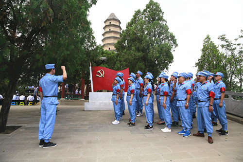 圖為黨員在梁家河合影 不顧前一天的舟車勞頓,第二天一大早,黨員們整裝出發(fā),在紅色旗幟引領(lǐng)下,頂著烈日,一路步行到達(dá)寶塔山山頂?!笆肿S土我不放,緊緊兒貼在心窩上。幾回回夢(mèng)里回延安,雙手摟定寶塔山。”綜合支部的小周對(duì)著寶塔山,情不自禁地大聲誦讀起賀敬之的《回延安》。黨員們?cè)谖∥毸赂吲e右拳,用鏗鏘有力的聲音宣讀了入黨誓詞,對(duì)于大家來(lái)說(shuō),重溫入黨誓詞是共產(chǎn)黨員表達(dá)自己為共產(chǎn)主義奮斗終生的最佳方式,黨員們的心靈再次受到震撼和洗禮。