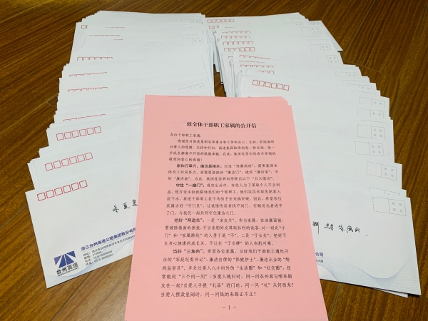 集團(tuán)開展致全體干部職工家屬的公開信活動 6月18日,集團(tuán)緊貼廉政教育月活動要求,將“致全體干部職工家屬的公開信”交到每一名職工手中,以這種家書形式廣泛宣傳廉潔清正的重要性,呼吁他們爭當(dāng)反腐倡廉的“廉內(nèi)助”。