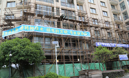圖為溫嶺水韻新邨外墻維修工程現(xiàn)場(chǎng)